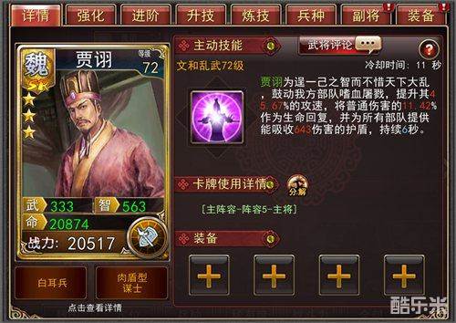 “毒士贾诩”谋者中的优秀人才!在游戏中属于魏国将领,作为肉盾型谋士的他,既可以担当前排肉盾,都可以担任起辅助的作用。技能“文和乱武”可以鼓动我放不对,提升全员攻速,并且将普通伤害按照百分比转化成生命值,并且为全部部队提供一个可以吸收伤害的护盾,是队伍中的中坚力量!