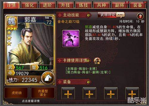 “鬼才郭嘉”在三国乱世名气更是火爆,一点不弱于诸葛亮与司马懿,在游戏中,郭嘉同样作为肉盾型谋士登场,但是不同于贾诩,郭嘉是骑兵兵种,这使他在战场上更具备机动性。技能“舍命之助”可以降低自身生命值,增加我方魏国部队的武力,并且有一定几率可以使我方魏国部队免疫普攻攻击!