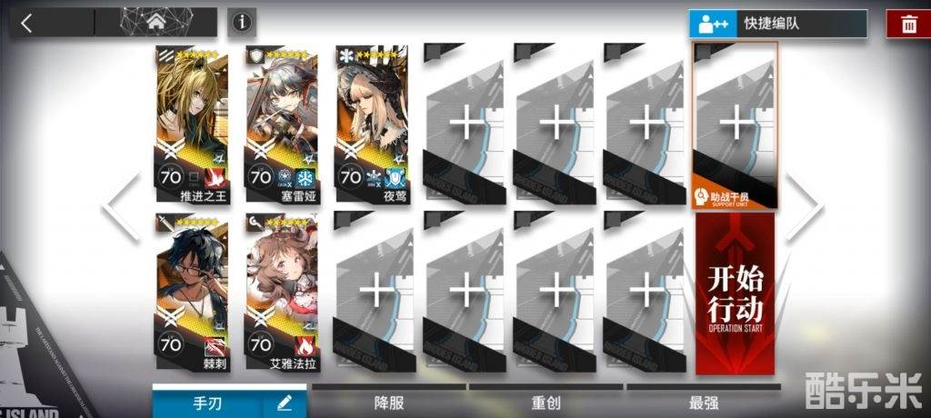 开局部署顺序为棘刺↓推王←小羊←夜莺←塞雷娅↓,然后挂机到结束。