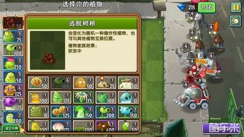 激光豆能够同时攻击多个敌人(攻击整条线上的敌人),还是不错的选择。还有这个关卡系统固定选用逃脱树根,没有这个植物的玩家可能不太了解这个植物,其实他也是非常不错的选择,因为他会变化为随机一种爆炸性植物,也可与其他植物互换位置,缺点就是恢复时间长。