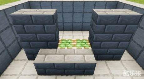 接着在左侧放一个石块,粘性活塞(朝下),侦测器,底部三个石块上布置红石。