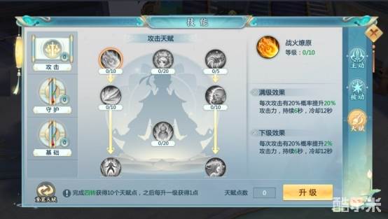 天赋分为三大类:攻击、守护、基础。每个天赋都有等级上限,不同天赋有不同的技能等级上限,天赋每提升1级,对应增加的技能效果或属性都会获得大幅提高!