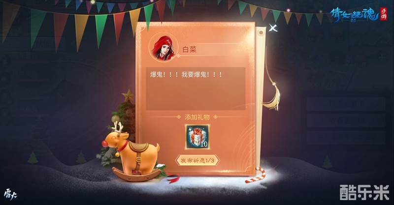 与此同时,帮会将出现飘雪的圣诞树,帮会成员可在树下祈愿,亦可挂上美好心意,互赠圣诞华礼、圣诞星礼。挂起灵玉礼物数量排名前20的帮主、副帮主、长老每晚22:00还可在圣诞树处开启专属活动,圣诞老人及神鹿使将携好礼降临部分帮会,帮会成员可前往拾取,共同欢庆圣诞,被选为神鹿使的玩家也将获得【瑞鹿哟哟·片影】。