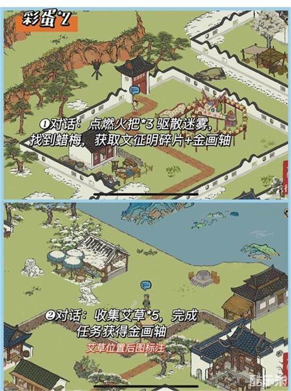 对话点燃火把*3驱散迷雾找到蜡梅,点击后获得金画轴和小文碎片