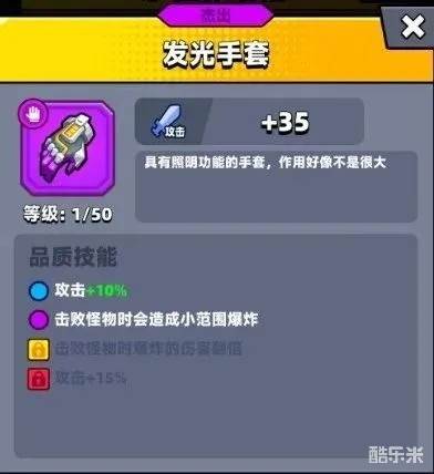 发光手套在紫色品质的时候,只要击败怪就会造成一个小爆炸,只要进入了中期基本都是怪挨着怪的,所以不用去担心炸不到怪,这个手套只适合刷怪,因为它的伤害不是特别的高,打boss的时候就没有什么很大的用处。