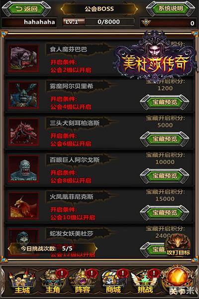 每个BOSS都守护着一个宝藏,未将公会BOSS打败之前,玩家可以查看自己即将获得的宝物。开启宝藏需要全体成员的齐心协力,因为所有成员挑战公会BOSS所获取积分总和达到最低领取标准时,才可开启宝藏,并领取奖励,所获得的会贡奖励还可在公会商店里换购需要的道具哦!所以请大家团结一致,合力完成挑战吧!