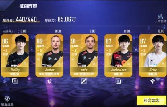 这套阵容的优势在于五个散装羁绊,且全员金卡,也是Shy散的最优套路。比较麻烦的是Caps的获取。