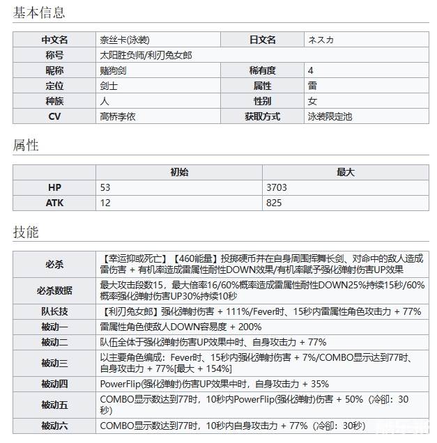 被动三以主要角色编成:Fever时、15秒内强化弹射伤害 + 7%/COMBO显示达到77时、自身攻击力 + 77%[最大 + 154%]
