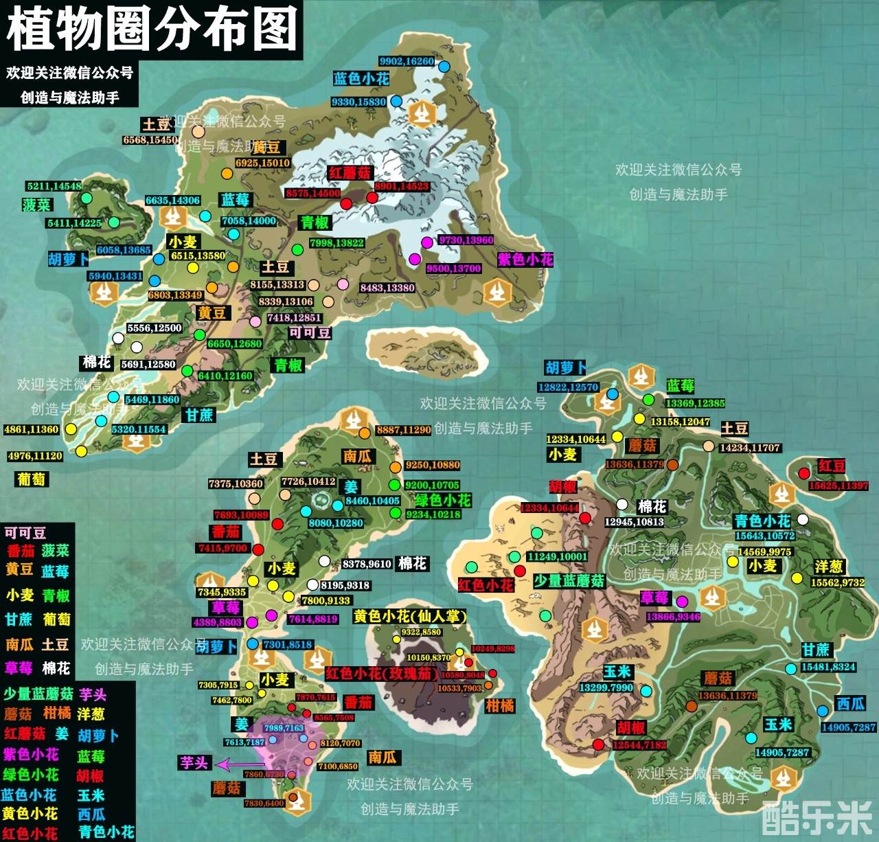 下图就是目前最新版本的植物分布了,大家可以根据自己的需求来选择去哪刷植物。目前没有详细坐标,只有大概位置,大家前往下图附近位置接口。