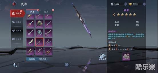 枯冢这把剑,没有特效以前看着十分简陋,感觉手里拿着一根白色尖锐的骨头。但5星之后,剑身浑身散发着紫色的光彩非常个性!紫色代表着高贵典雅,搭配上游戏的一套女性时装,绝对很帅。它的属性是轻重击+绝学暴击时降低技能CD,其实在游戏的PK模式里还是很强的。