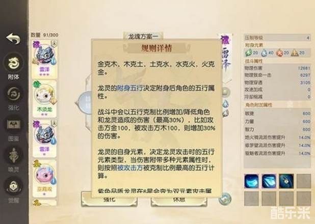 最后我们再来讲一下龙灵的五行压制效果哦,比如说你的龙灵是金100,我的龙灵是木100。根据五行相生相克的原则金克木,那么你打我能提升百分之三十的伤害,我打你则降低百分之三十的伤害。
