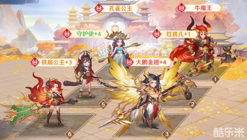 1、牛魔王 2、红孩儿 3、大鹏金翅 4、孔雀公主 5、主角 6、铁扇公主
