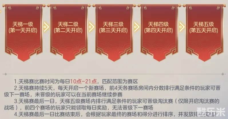 巅峰夺魁天梯赛的匹配范围为“山河遗迹”玩法的赛区,初始大家都会被平均分配到天梯一级赛场,根据每日排名决定是否可以晋级下一级,但是没有晋级玩家也可以继续参加比赛,直到第五日,会从天梯五级中选拔出排名靠前的玩家进入到后续淘汰赛阶段。