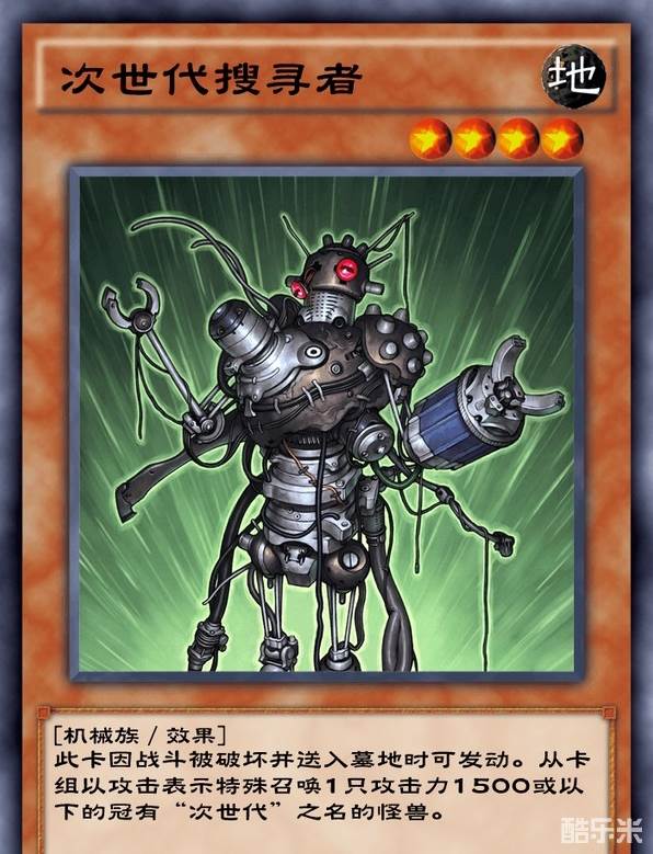 【次世代搜寻者】(机械族/效果)此卡因战斗被破坏并送入墓地时可发动。从卡组以攻击表示特殊召唤1只攻击力1500或以下的冠有“次世代”之名的怪兽(大发现时代)