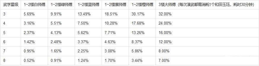 如果找的师傅刚好对应自己所需升级的武学,则会在原基础上进行额外加成,具体如下,例如,你需要提升剑职业的3星 武学,找了个精通剑法的橙色师傅,则,除了基础的30%的加成外,还有额外加成,最终是30%(1+45%)=43.5%的进度。