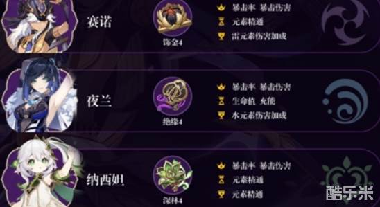 赛诺是队伍的主要输出,和纳西妲可造成激化反应,夜兰作为副c,还可以给站场的赛诺提供伤害加成,而久岐忍则是队伍的奶妈担当,同时还可以堆取元素精通提高超绽放的伤害。