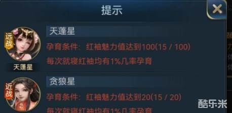 首先子女需要在后宫中和佳丽一起就寝后就有几率获得,也可以通过赠送各种信物提高魅力值,等到魅力值达到要求时就可以获取。小编以最常见的红袖为例,可以带下三名不同的子嗣,分别是近战贪狼星,远战天蓬星和近战文曲星。有了这些子女后,就可以在幼主府中找到,也可以在幕府中通过训练子女天赋,获得天木梁后提升幕府等级,可以提高子女的天赋加成。