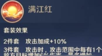 满江红是游戏里面的一个攻击类型的信物,它可以增加携带者的攻击力,特别是三件套的效果在攻击范围内每多一个敌人就可以增加6%的伤害,最多可以增加36%的攻击伤害,完美的契合了白骨夫人的技能。