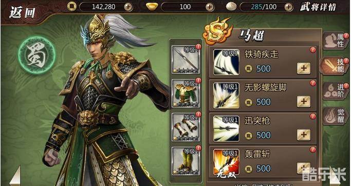 马超是获取成本最低的S级武将。攻速快,技能优秀,自带各种BUFF效果,适用于PVP和PVE。技能一【铁骑疾走】既能大幅降低敌人移动速度,还能增强自身攻击力,使马超在开局便占据下较大的优势。使用技能二【无影螺旋脚】,马超便可随心切入或脱离战场,绝不错过反击时机,也绝不会陷入难以逃脱的困境,灵活性较高。技能三【迅突枪】附带提升防御效果,近一步增强马超在战场上的抗击性。无双技能【轰雷斩】百分百出暴击,有助于提升马超的伤害输出。简而言之,马超是在游戏前后期都可使用的武将,性价比高。