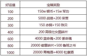 【活动内容】活动期间,每消费1000金币,即可获得100好运值,累计获得好运值可开启奖励宝箱。