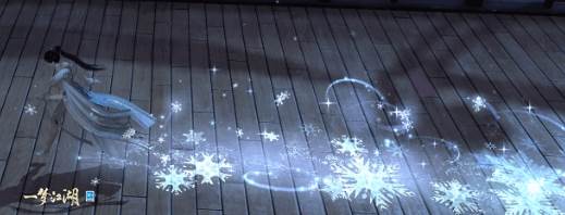 踏云·拂霜——以冬日飘扬的雪花为设计灵感,冰蓝的六角雪花在脚下绽放,冰霜雪点随着少侠的步伐在四周飞扬起舞,所行之处皆是冬日盛景。