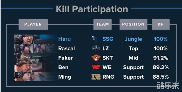 在参团率上,两名韩国队伍的打野上单均以100%的参团率力压Faker,位居榜首,咱们LPL的Ben和小明也分别以89.2%和88.5%的参团率进榜。