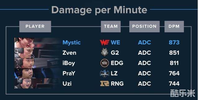 在每分钟输出上面,WE的大舅子以873的高输出勇夺榜首。G2的Zven紧随其后。首次参加世界赛的小昭输出也相当爆炸,压力前辈Pray和小狗,拿下第三。
