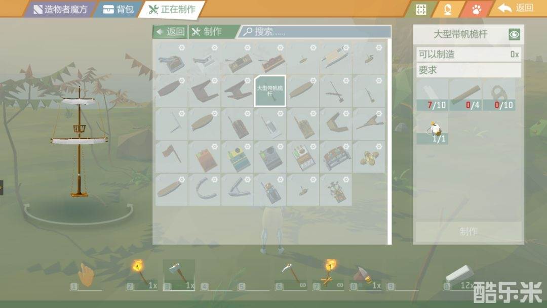 5、接着制作和摆放带帆桅杆。在制作桅杆时要注意,用到的材料主要是原木、任意绳子、布、裁缝工具箱。只要岛主们制作了纺车和裁缝工具箱,到这一步会非常轻松。