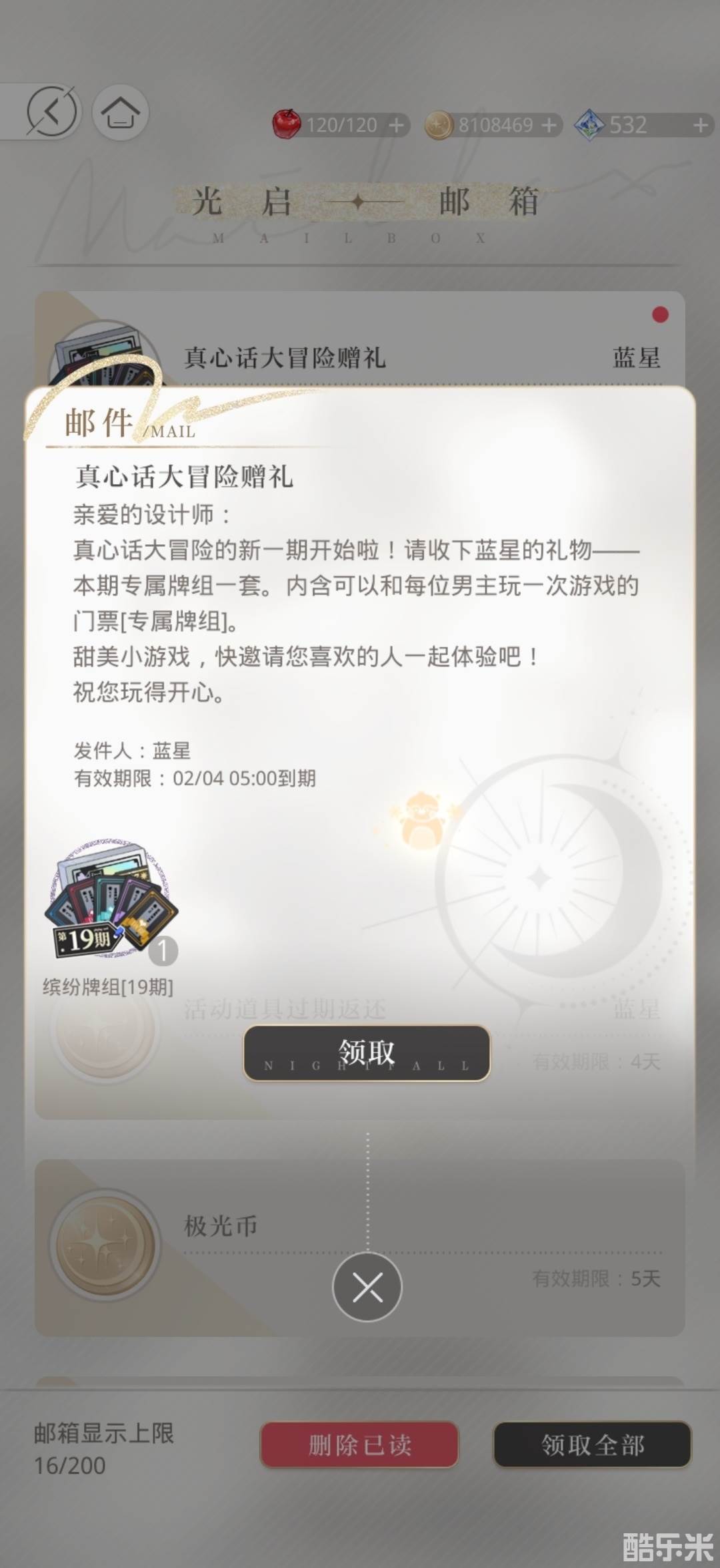 1、玩家可在邮箱免费领取一组第19真心话大冒险牌,剩下的三组需要用在购物→五区→迷境,用【星旅币】兑换,当期兑换三组只需【1800星旅币】。