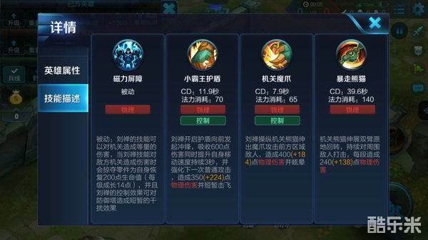 机关魔爪:刘禅操作机关熊猫伸出魔爪攻击前方,造成高额的伤害和眩晕。二技能可以配合一技能加速,来更好的命中敌人。二技能可以对防御塔造成伤害,以及干扰防御塔。可以加快推塔的速度。