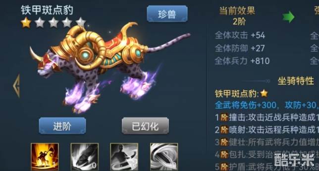 强化等级无论更换哪一种坐骑都会生效,而接下来的幻化和进阶则是改变外形,目前一共提供了五种坐骑外形,分别是铁甲斑点豹、雷兽牛、重铠虎、火麒麟和幻灵仙鹿,只要获得对应珍兽皮肤就可以直接切换。不同类型的坐骑拥有不一样的特性,例如铁甲斑点豹可以使武将获得免伤,攻防提升和兵力提升等效果,还会附加撞击、喷射等技能。