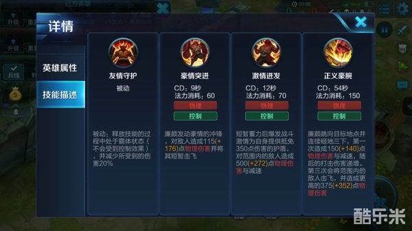 豪情突进:这个技能可以将目标击飞并对其造成伤害。在打团时,可以用一技能先手开团,抢先一步控制敌人。一技能的冲撞距离较远,可以选择绕后袭击敌人。