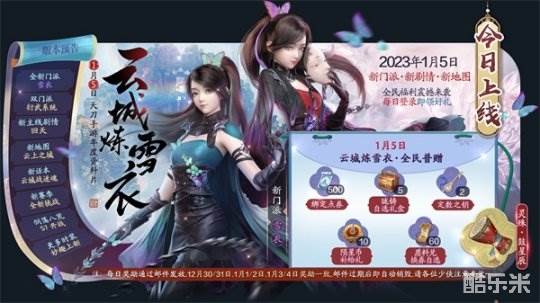 新门派、双门派、新玩法、新剧情……海量版本内容与多重新春福利尽在天刀手游年度资料片《云城炼雪衣》,与万千少侠一同开启2023全新江湖之旅!