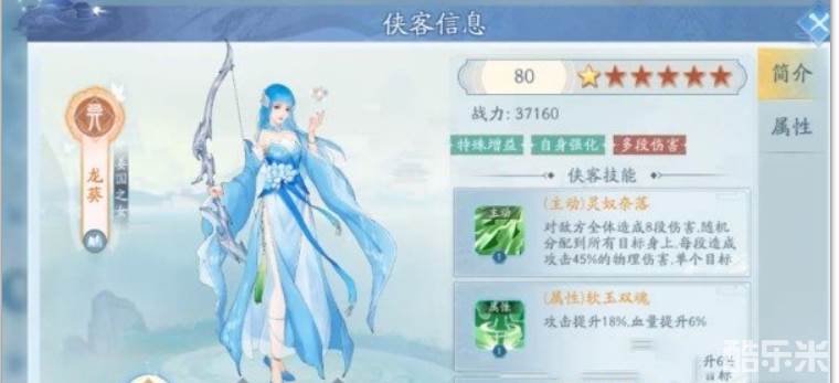 属性技能是带来18%的攻击力提升,以及6%的血量提升。这个提升对于龙葵来说是比较不错的,能够提升很多的生存能力。最后是被动技能,被动技能战斗开始会为随机目标附加一个BUFF,后续龙葵对该敌人造成伤害可以获得速度属性和伤害属性的提升。