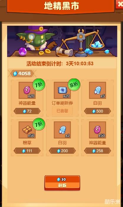 7、最后关于这一个活动可以为我们节省很多的钻石,当然这个也是看个人运气的,有时候运气好就刷出正好需要购买并且打折的资源,当然有一些不打折的资源就看个人的决定要不要购买,如果不着急使用并且钻石不够的话,小编还是建议等地精黑市刷新出打折再购买。