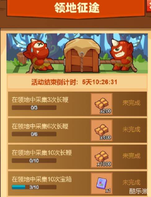 2、第二个任务就是在领地中分别采集10、20、40、60、80、100次宝箱,这个任务的奖励完成可以获得2、3、4、5、6个宝石卷,不过这里宝箱的拉取应该也是只能拉取自己领地的。