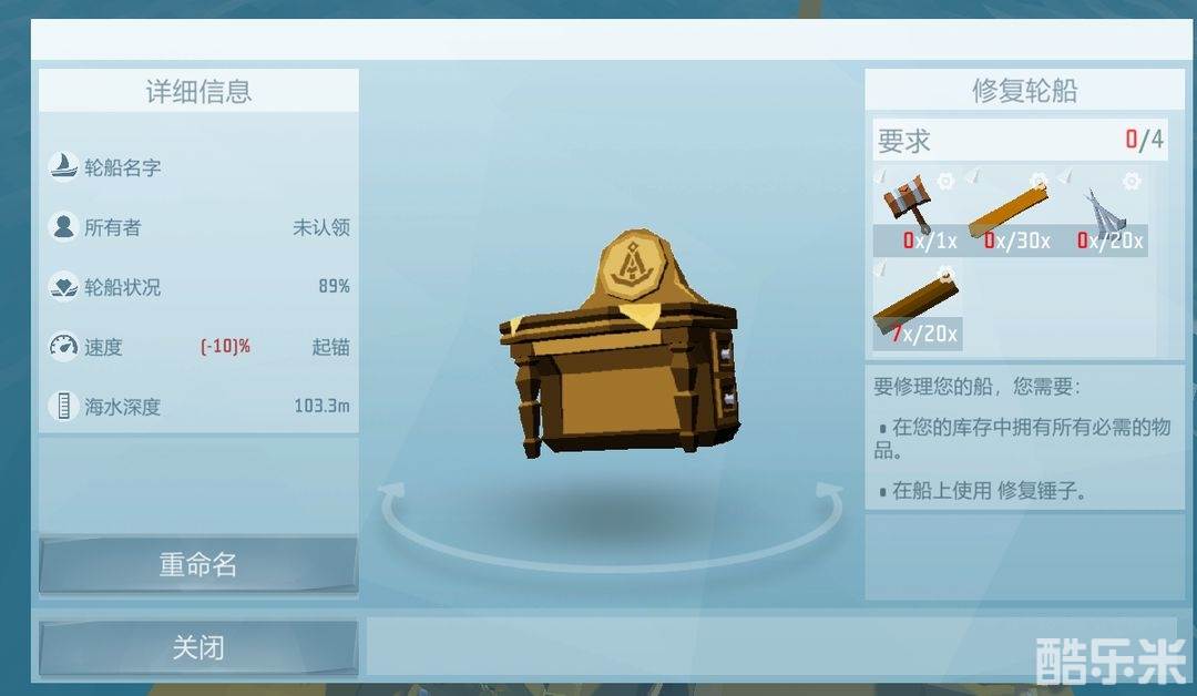 一般情况下,修复船只需要准备【修复锤子x1】+【木板】+【钉子】+【原木】,具体材料数量要看信息表中的提示。