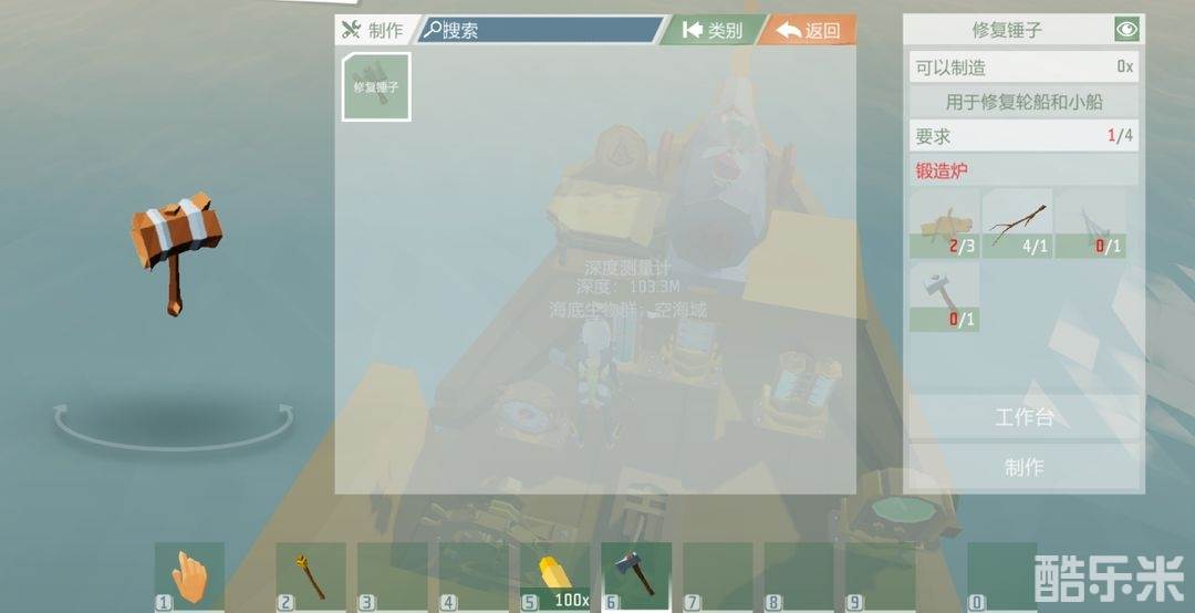 准备好【锻造炉】工作台之后,去拾取【木片x3】+【木棍x1】+【钉子x1】+【任意锤子x1】。在锻造炉工作台中进行加工和制作【修复锤子】。