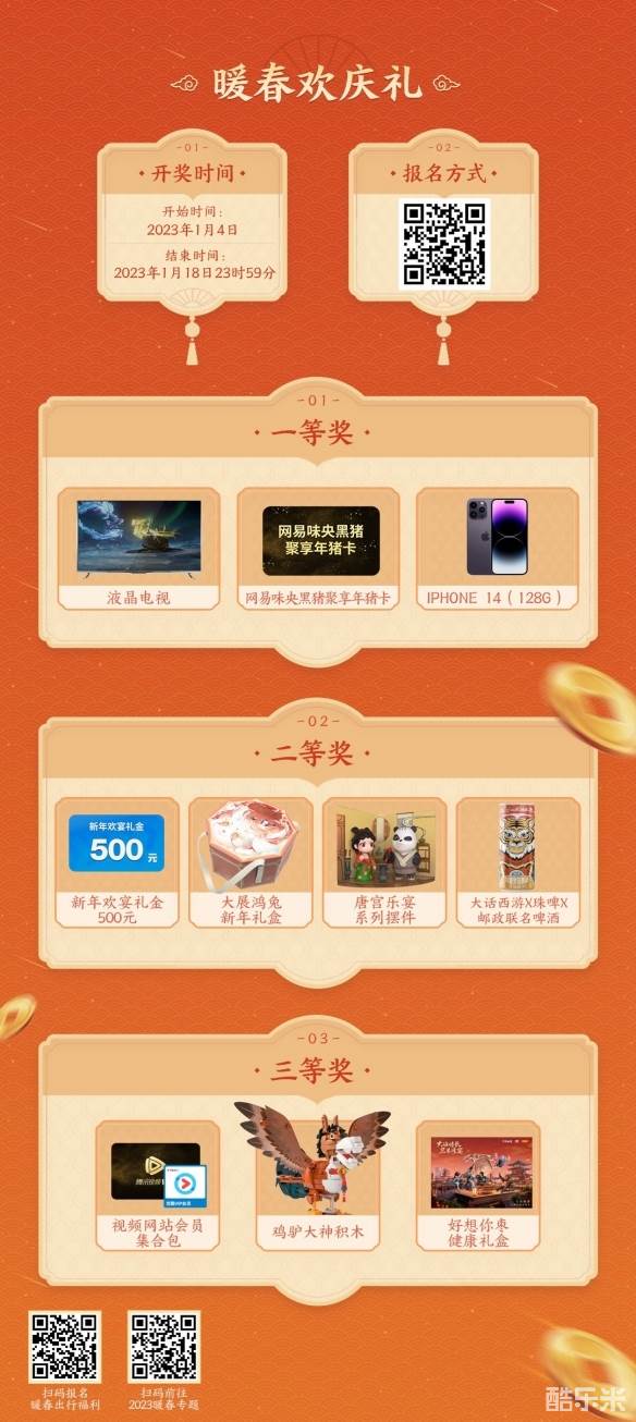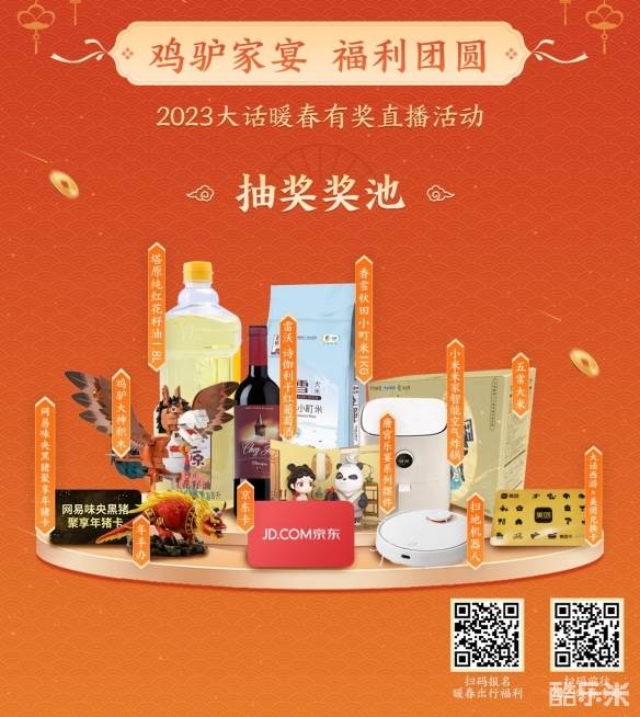 即日起至2023年1月18日23时59分,通过专属链接进入专题页。点击“鸡驴送福”—“我要报名”,填写报名信息即可参与抽奖。小米液晶电视、iPhone 14、500元欢宴礼金、“大展鸿兔”新年礼盒、腾讯视频、爱奇艺、优酷三大视频网站会员等好礼承包你的新春欢乐年货!