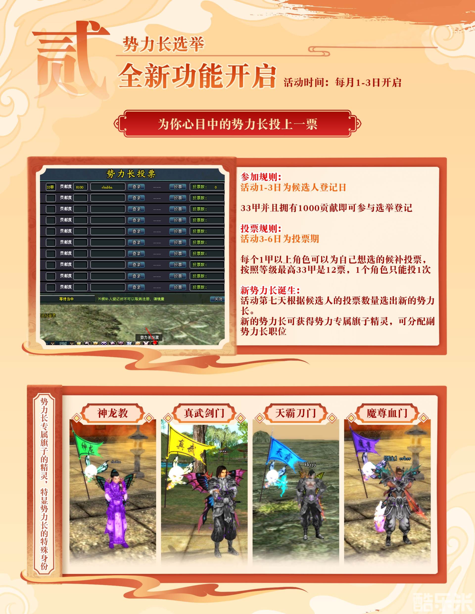 势力长选举制度,贡献值比拼,拉票投票,当选即可获得专属势力长旗帜精灵,彰显王者霸气!