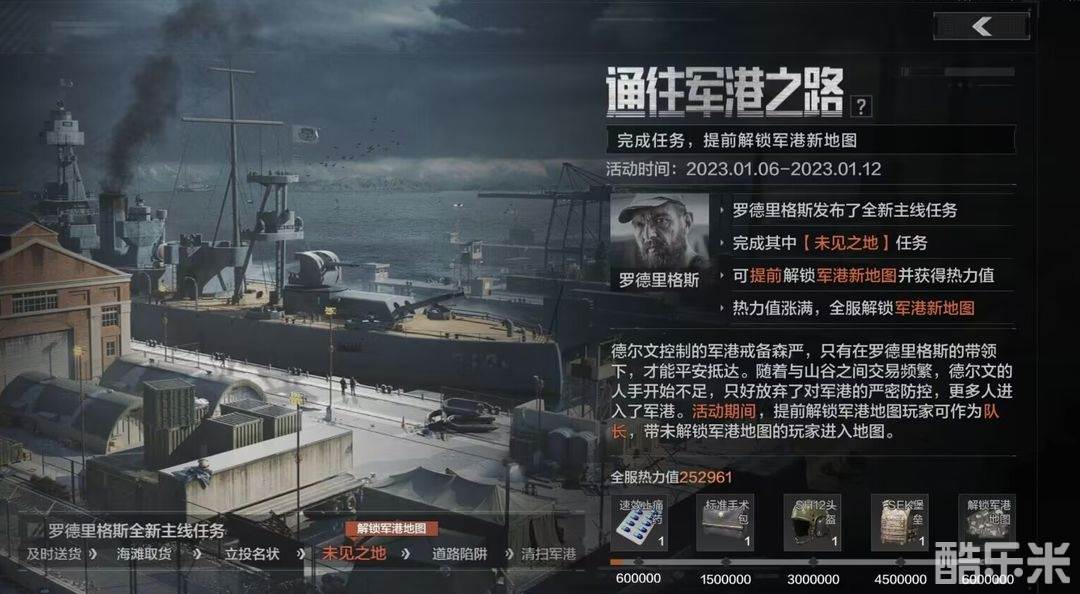 罗德里格斯发布了全新的主线任务【未见之地】,完成任务即可提前解锁军港新地图并且获得热力值,助力全服玩家一起解锁军港地图!全服热力值达到一定数值,还将额外解锁装备福利!如果你已经提前解锁军港地图,也可作为队长带领未解锁军港地图的先锋进入军港。
