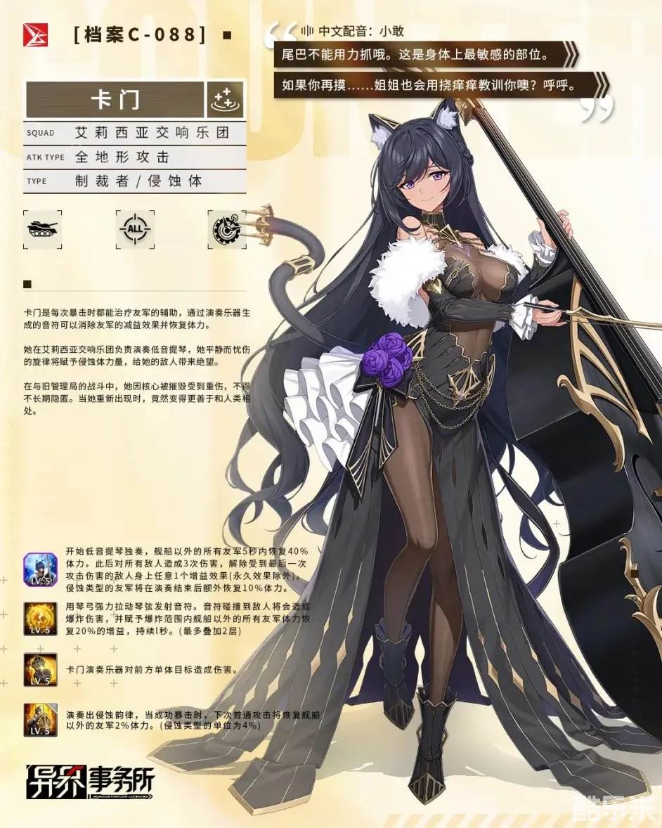 卡门是每次暴击时都能治疗友军的辅助,通过清奏乐器生成的音符可以消除友军的减益效果并恢复体力。