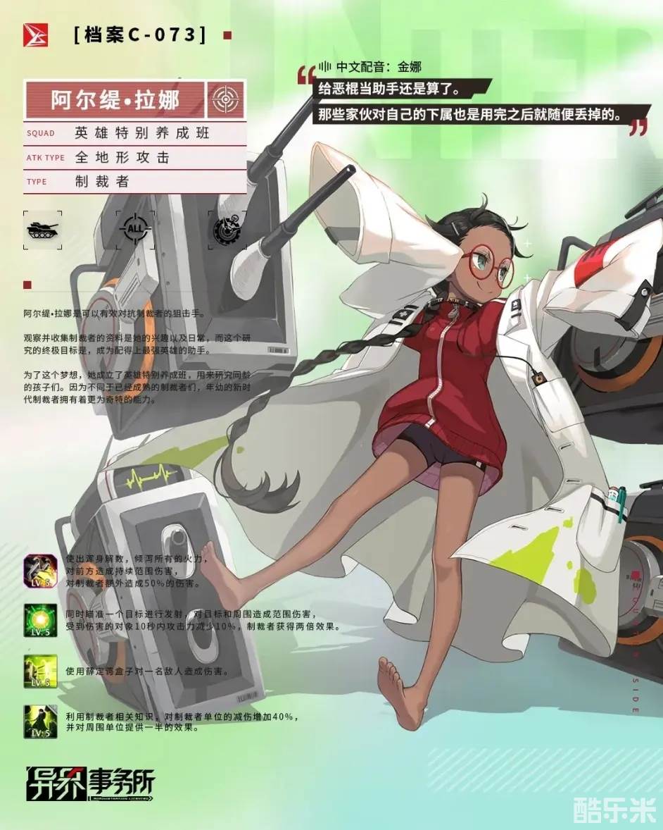 对制裁者特化的狙击,被动提供了强大的对制裁者常驻增减伤效果,不过碍于面板不高,就算打制裁者伤害也一般,pvp面对警车和被一些技能蹭到更是秒躺,更大的意义还是给队友提供buff来辅助队伍对抗制裁者,其余无论是打伤害还是控制能力都很有限,不过2费的低廉费用加上狙击职业可以作为优质的领航员触发姬。pve以侵蚀体和机械为主,因此价值不高,pvp作为对制裁者buff手来提供整体增益,自身也能补充一定对制裁者输出和用来触发领航员,需注意很容易暴毙,若无把握生存基本就算白给2费,且面对机械和小兵会比较尴尬