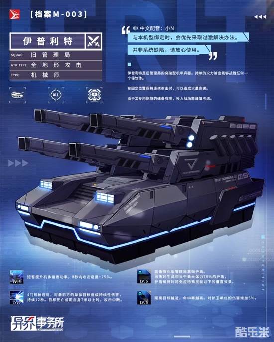 伊普利特,外号小火龙,3费前锋机械单位,是旧管理局的突破型机甲兵器,也是机械单位中的顶级输出,它的超强破坏力使它突破了机械单位在机械队伍中才能发挥作用的局限,经常活跃于各种战斗中。