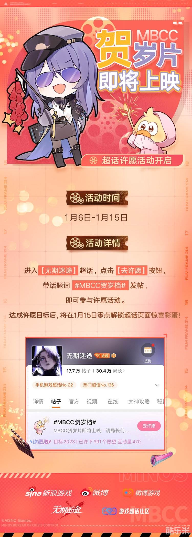 进入无期迷途超话(点击前往),点击【去许愿】按钮,带话题词 #MBCC贺岁档# 发帖,即可参与许愿活动。
