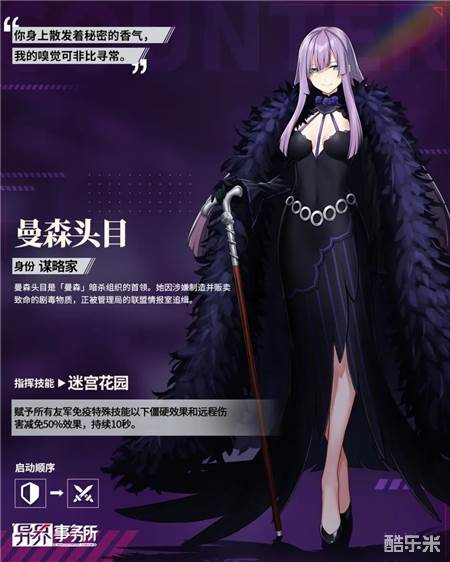 曼森组织的头目一向对培养艳丽与狠戾的花朵乐此不疲,但大抵也没有预料到,最夺目的花,她花枝上的尖刺会将锋芒朝向自己。永恒之花风波后,曼森头目将以新SSR机务员的身份为科芬公司效力,该机务员的雇佣概率UP卡池将同步开放,老板可使用雇佣契约书前往雇佣。