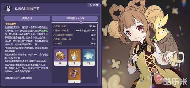 元素爆发“玉颗珊珊月中落”,解放月桂的全部潜能,对敌人造成范围草伤,并进入“桂子仙机”状态。该状态下产生的白玉萝卜将转为依据大招属性造成伤害和治疗,简单来说就是属性更强了,炸裂时还会为全队回血。另外桂子仙机会周期性召唤“月桂·弹跳型”直到上限(3个),目标选择方式和投掷型相同,弹跳型的效果是给瑶瑶加15%移速和50%草元素抗性(固定,不随等级变化)。瑶瑶退场时结束桂子仙机状态。大招耗能80点,持续5秒冷却时间20秒。