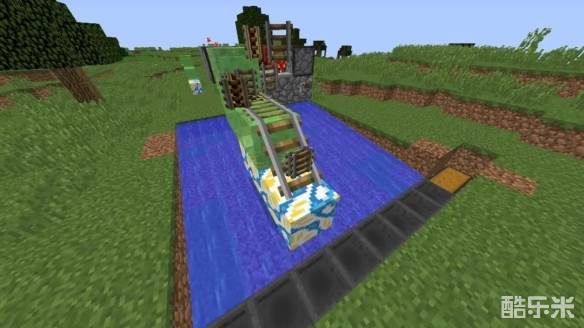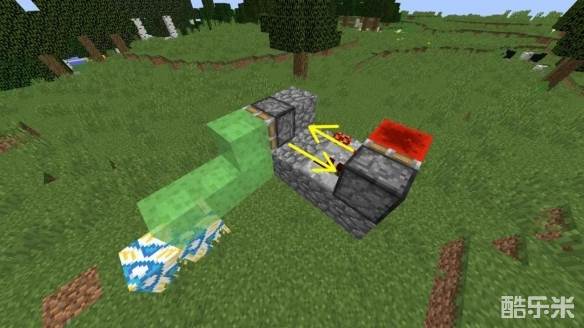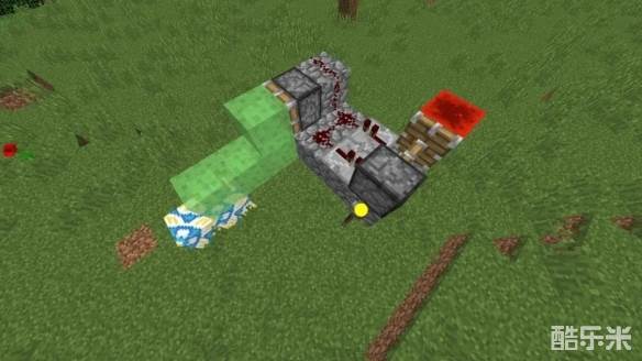 此时在粘液块上放置两段铁轨,再补放一个带釉陶瓦和一段铁轨。
