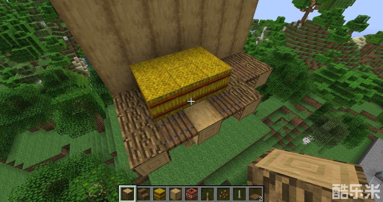 需要材料:橡木、橡木原木、云杉木楼梯、活板门、深色橡木楼梯、干草块