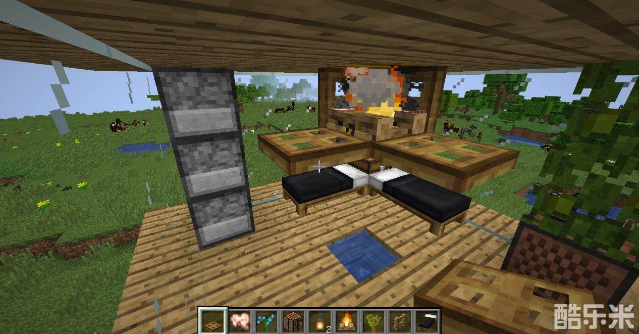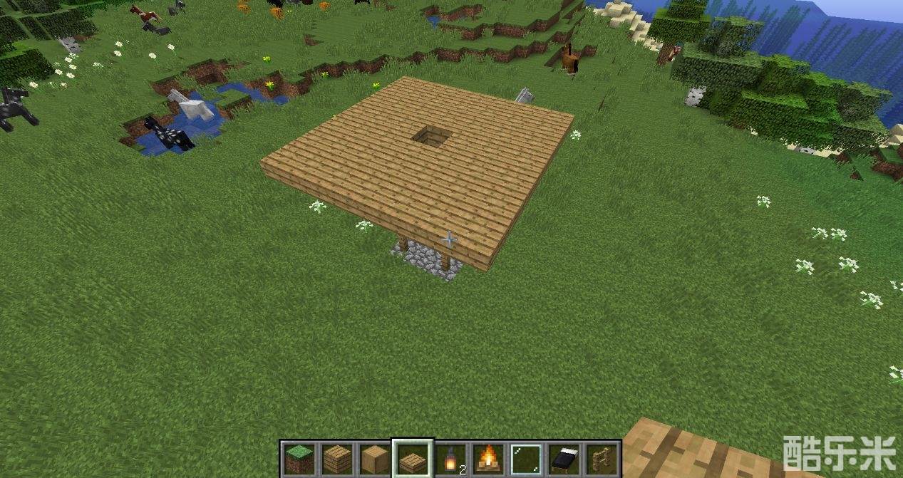 5、中间位置补上橡木木板和干草块。干草块上放上篝火,四周围上云杉木活板门,小屋顶部就做好啦!